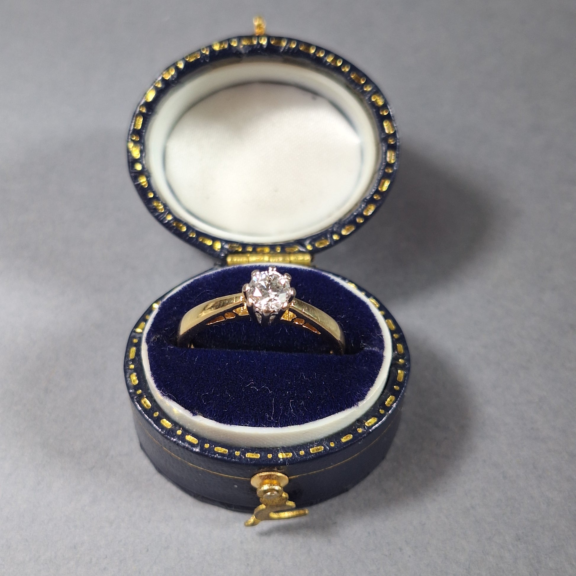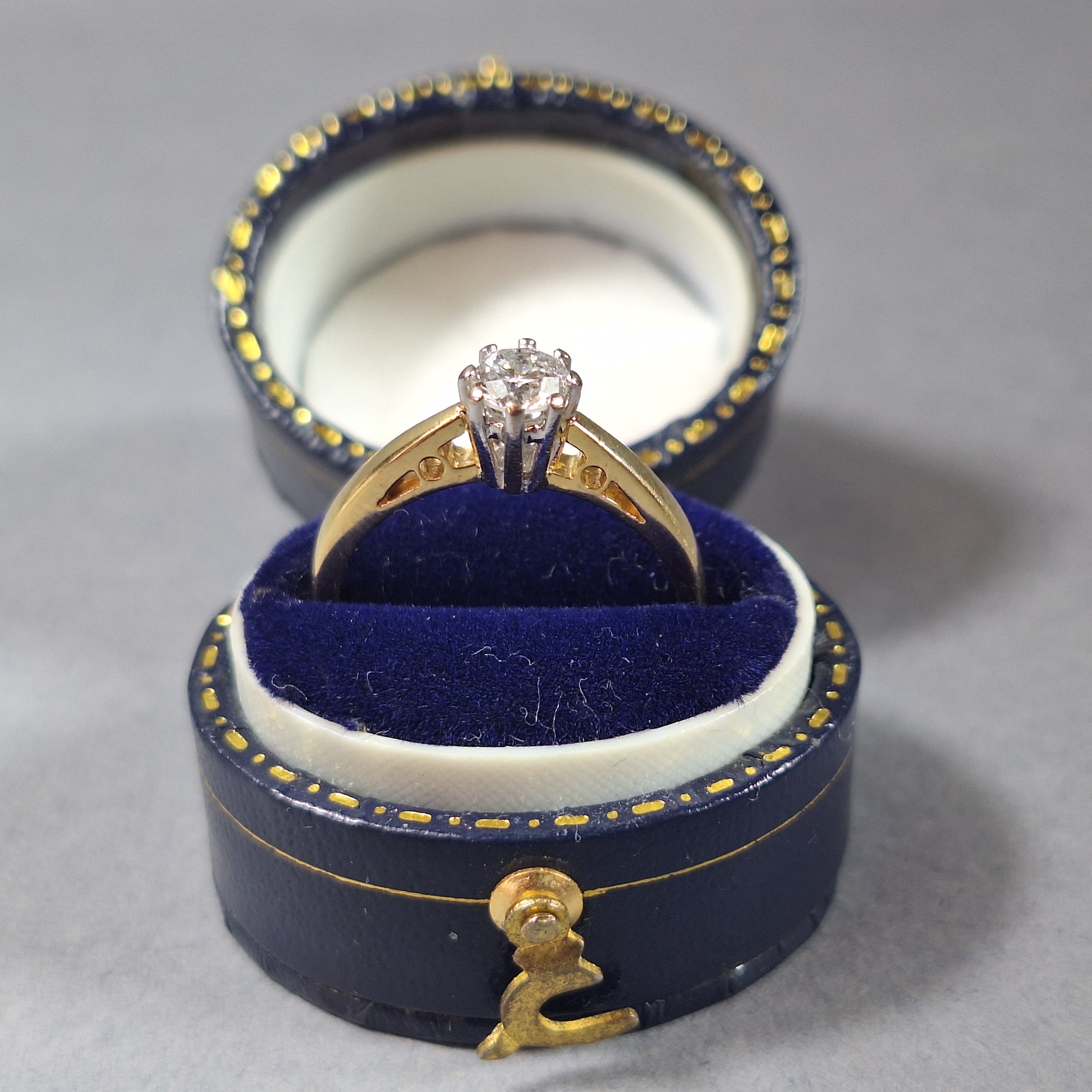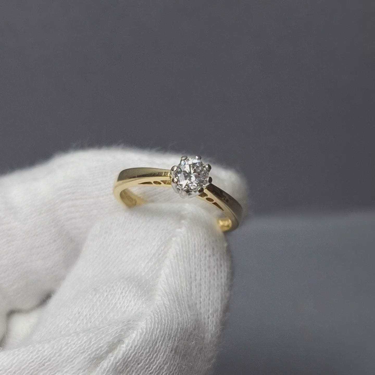 18ct Gold Engagement Ring set with a 33point Diamond of good colour and clarity, held in place with 8 claws. Very good condition. This timeless design is a modern classic that will last for years to come, giving you a piece of jewelry you can be sure to pass through generations.
