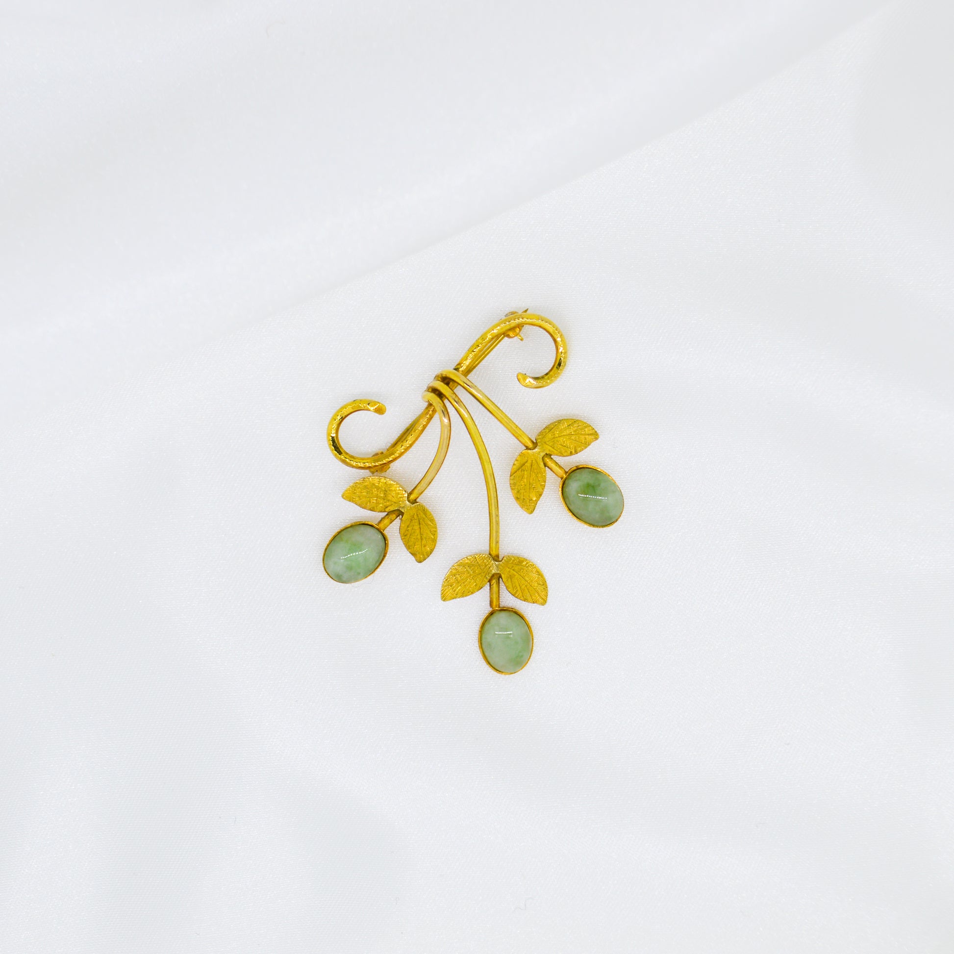 This 9ct Yellow Gold Jade Brooch with delicate floral symbols meets timeless elegance. Crafted from 9ct yellow gold, the piece features intricate nature-inspired detailing that captures the organic beauty of blooming flowers. The Jade stones provides striking contrast against the warm gold, creating a versatile accessory that elevates both contemporary and classic wardrobes. Perfect as a statement piece or cherished heirloom, this brooch embodies refined craftsmanship and enduring style.