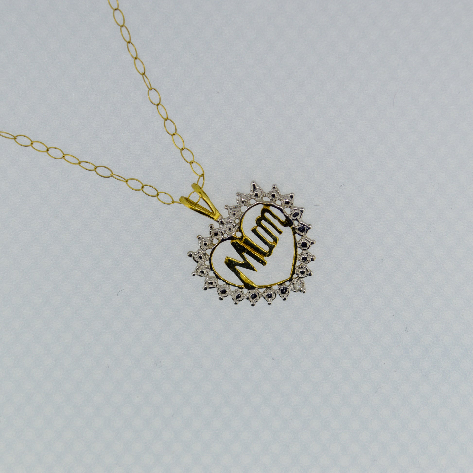9ct Yellow gold 'Mum' pendant with White Gold detailing, on a trace chain