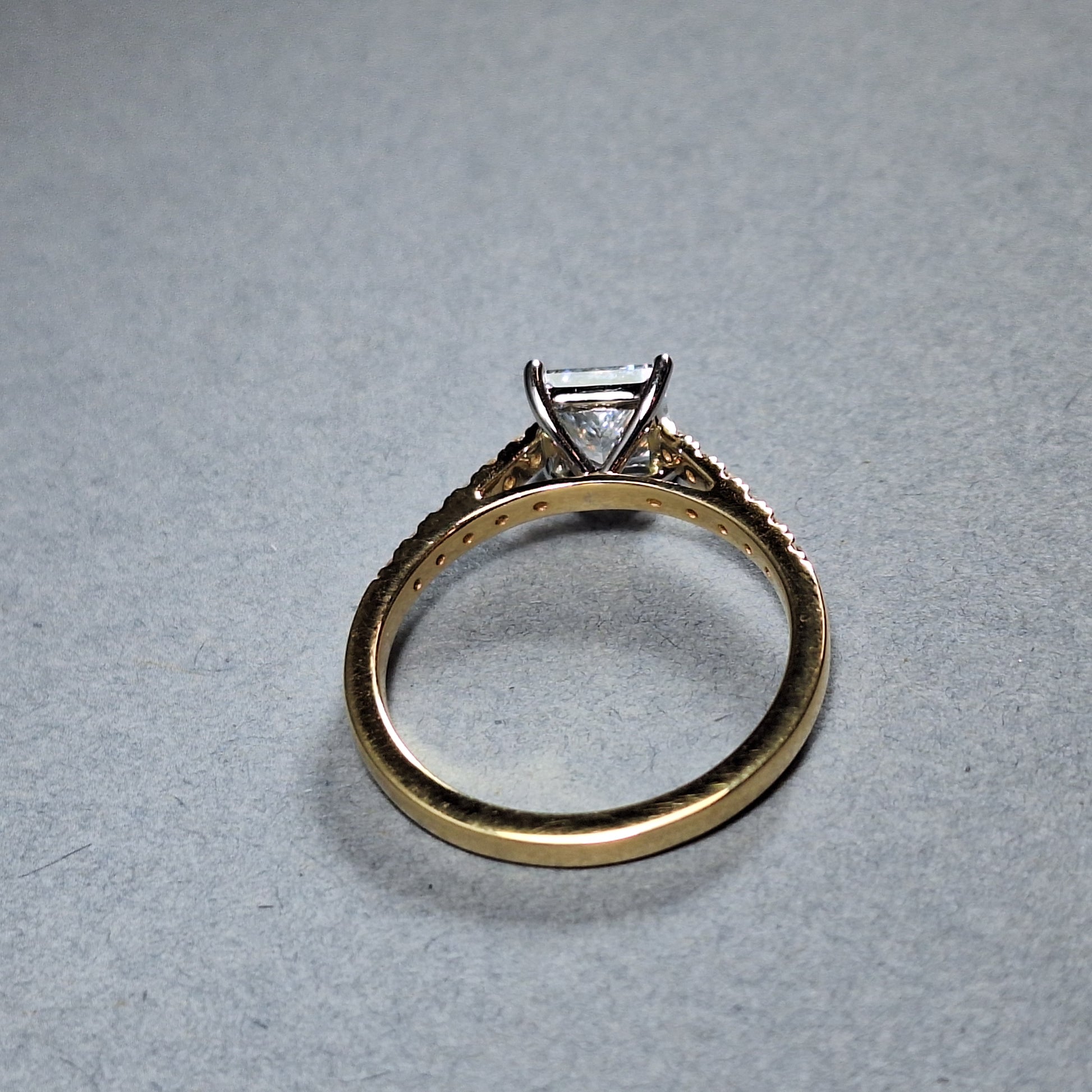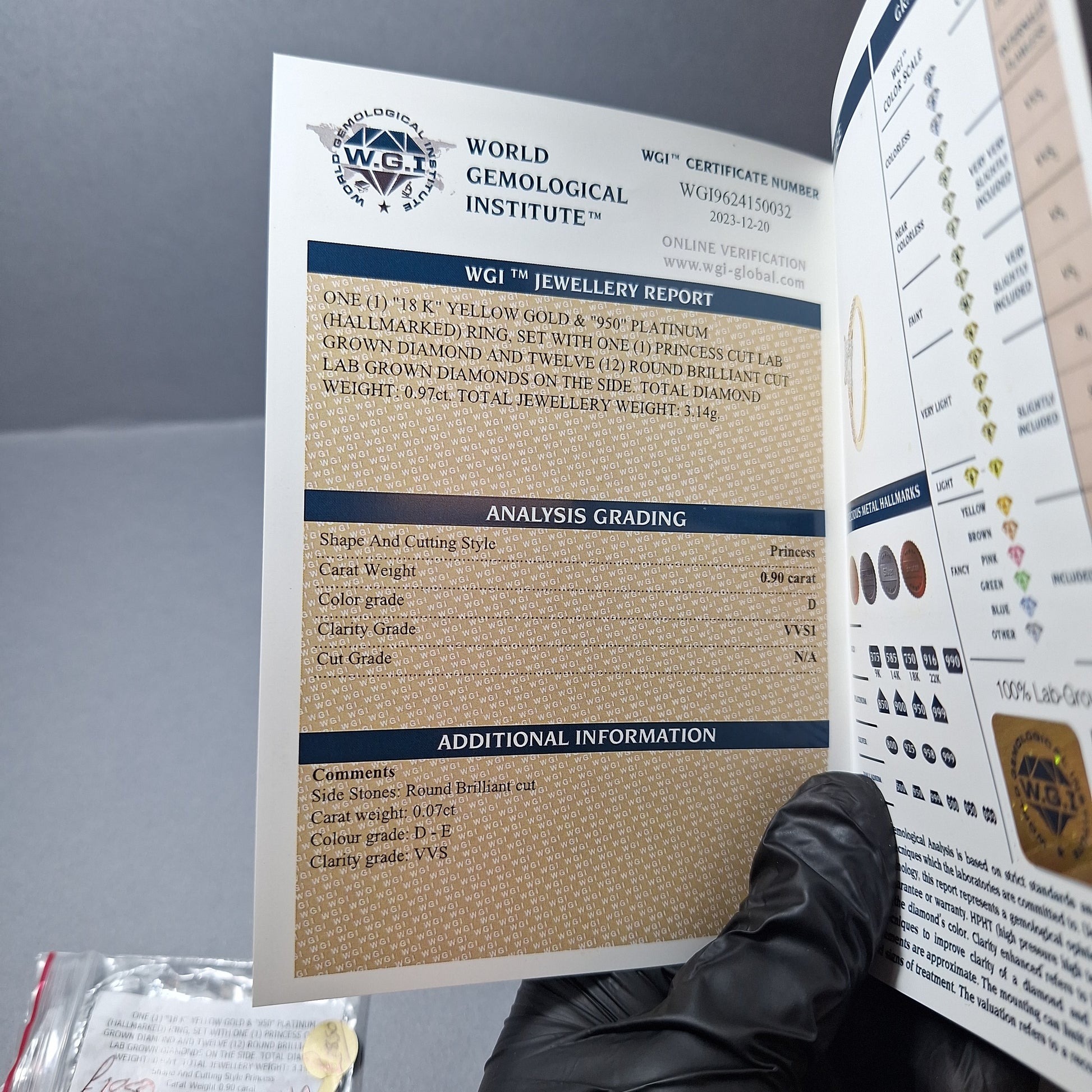 New Princess Cut 0.9ct Lab Grown Diamond & twelve Round Brilliant Cut Lab Grown Diamonds down the sides all placed on an 18ct Yellow gold Band