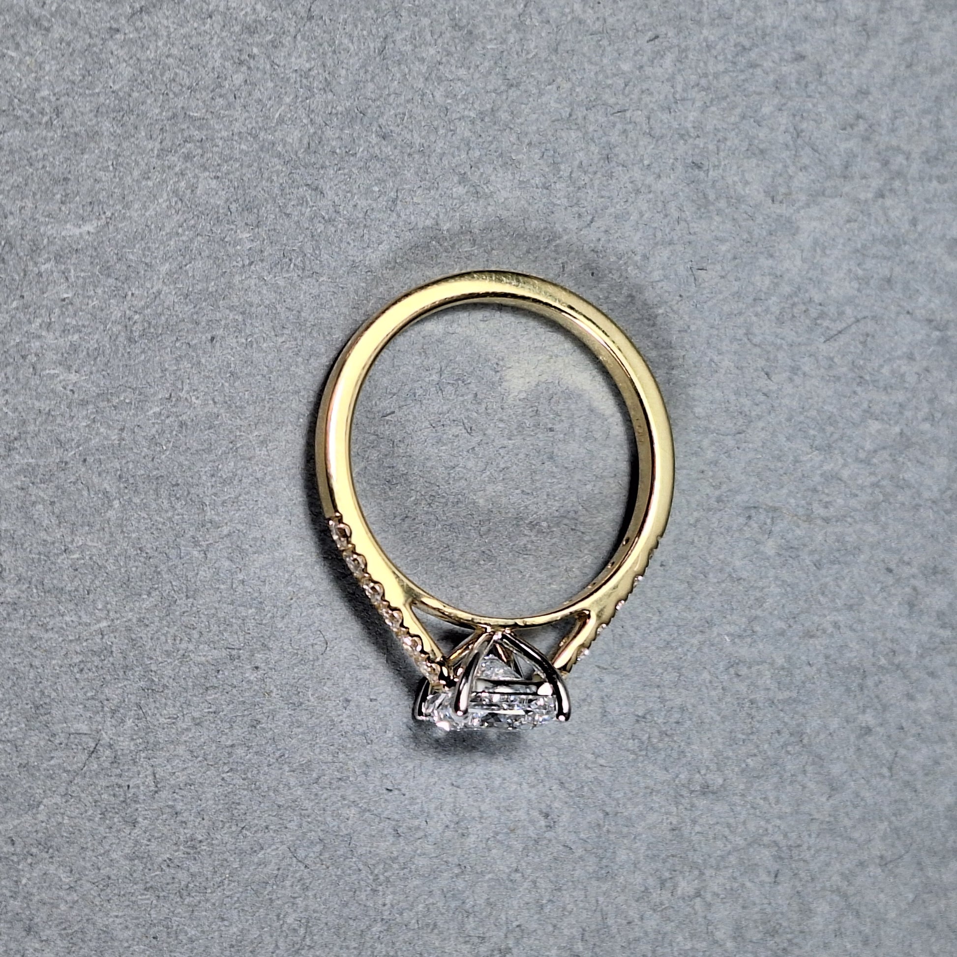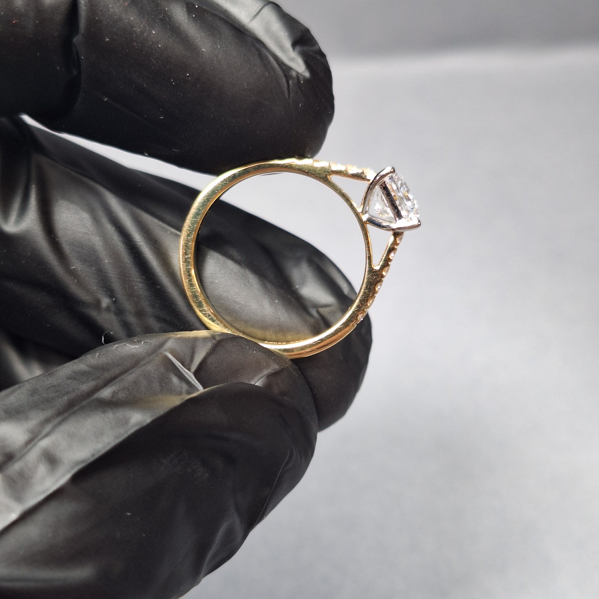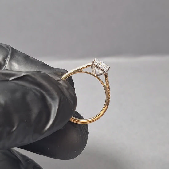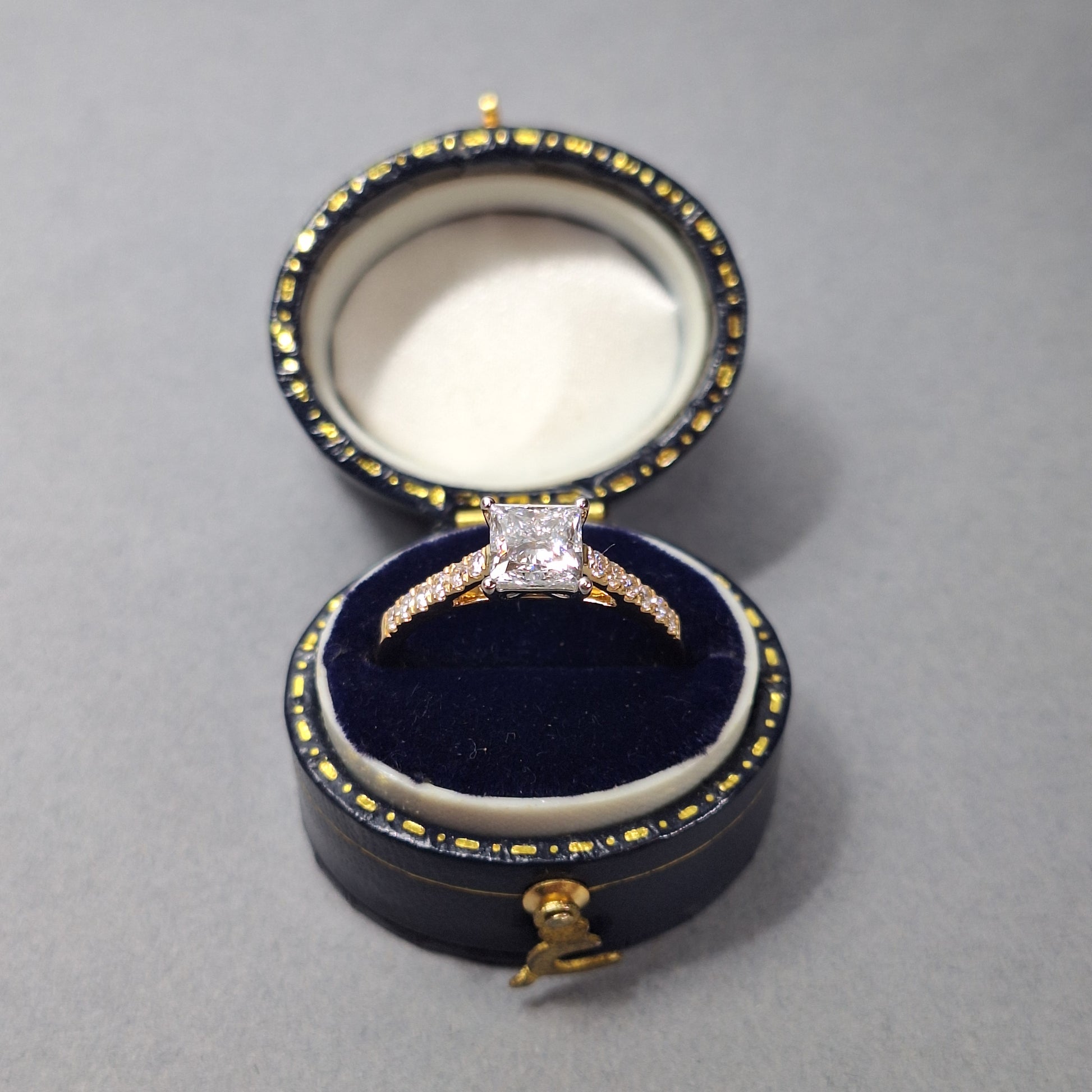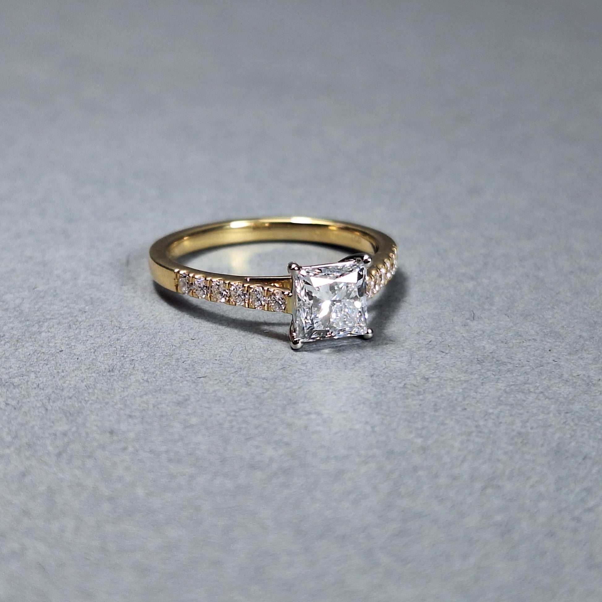Upgrade your jewelry collection with our New Princess Cut 0.9ct Lab Grown Diamond ring. The center diamond is complemented by twelve Round Brilliant Cut Lab Grown Diamonds down the sides, all set on a luxurious 18ct Yellow Gold band. Enjoy the stunning sparkle and ethical sourcing of lab grown diamonds.