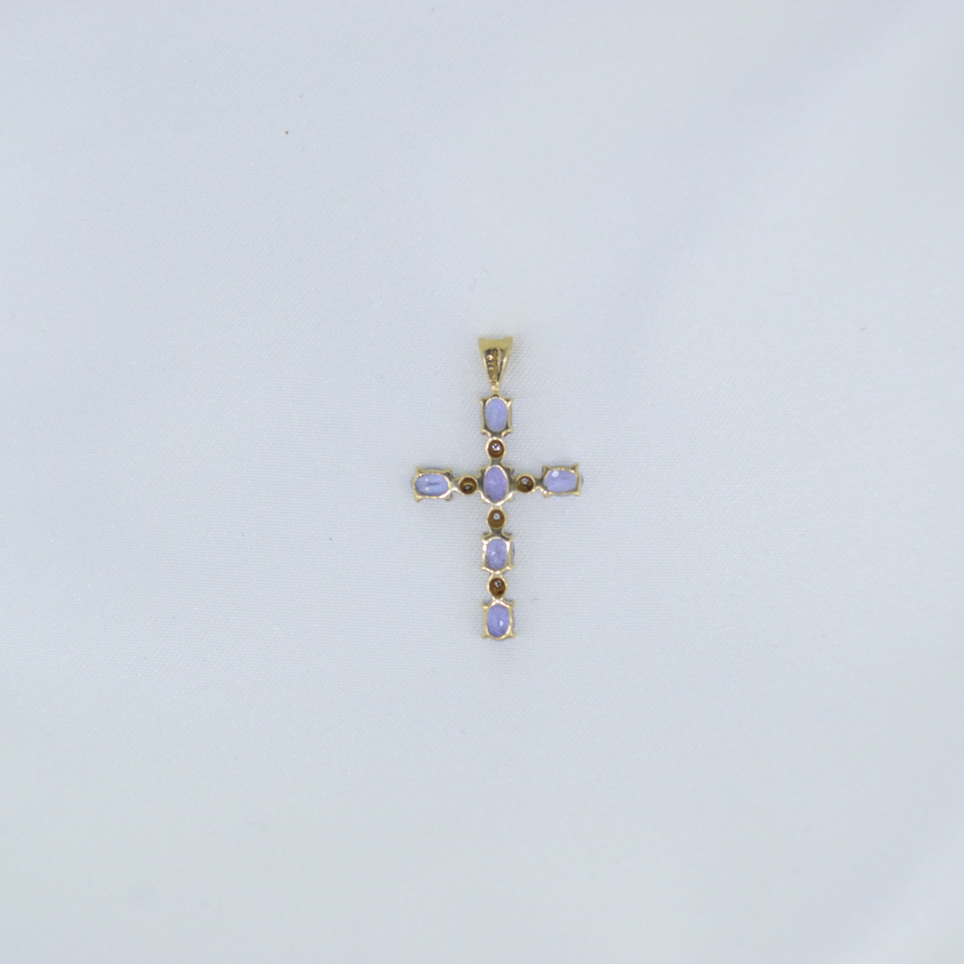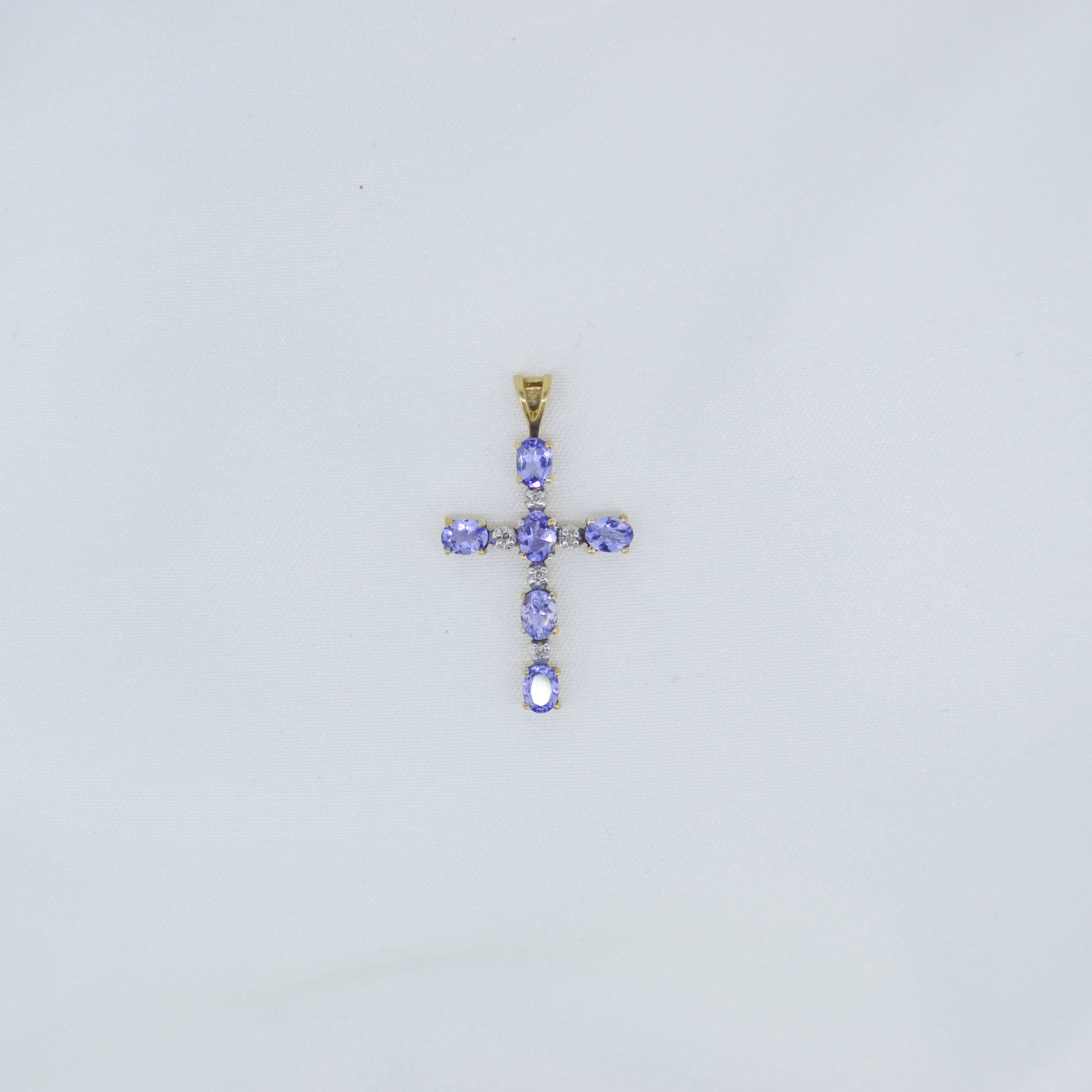 9ct Gold, Purple cubic zirconia, cross pendant. This elegant piece combines spiritual symbolism with contemporary design, featuring brilliant purple stones that catch the light beautifully. Perfect as a standalone statement or layered with other necklaces for a refined, personalised look. An affordable luxury addition to any jewellery collection.