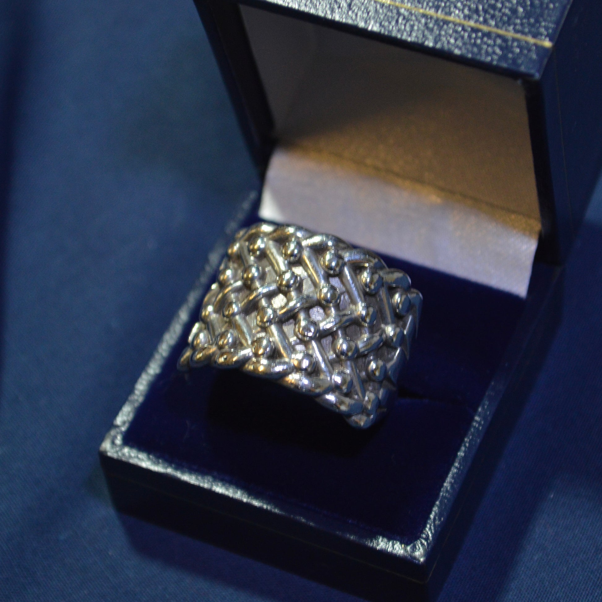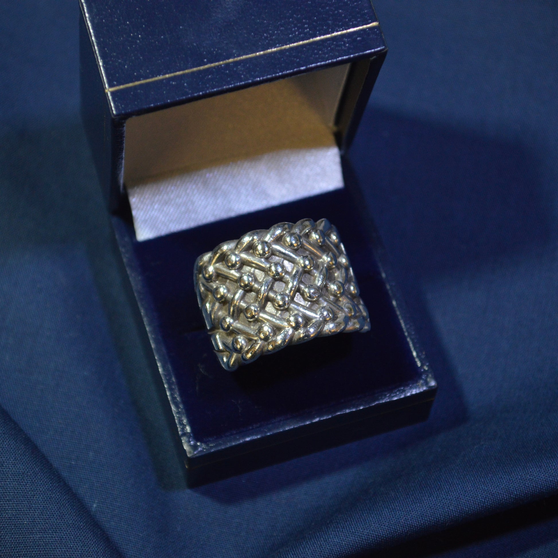 This pre-loved silver ring is the perfect accessory for any man. Crafted with high-quality material, it offers a timeless and sophisticated look. The perfect addition to any outfit, it is a must-have for any fashion-forward individual. Trust in its durability and design, and elevate your style with the Silver Keeper Ring.